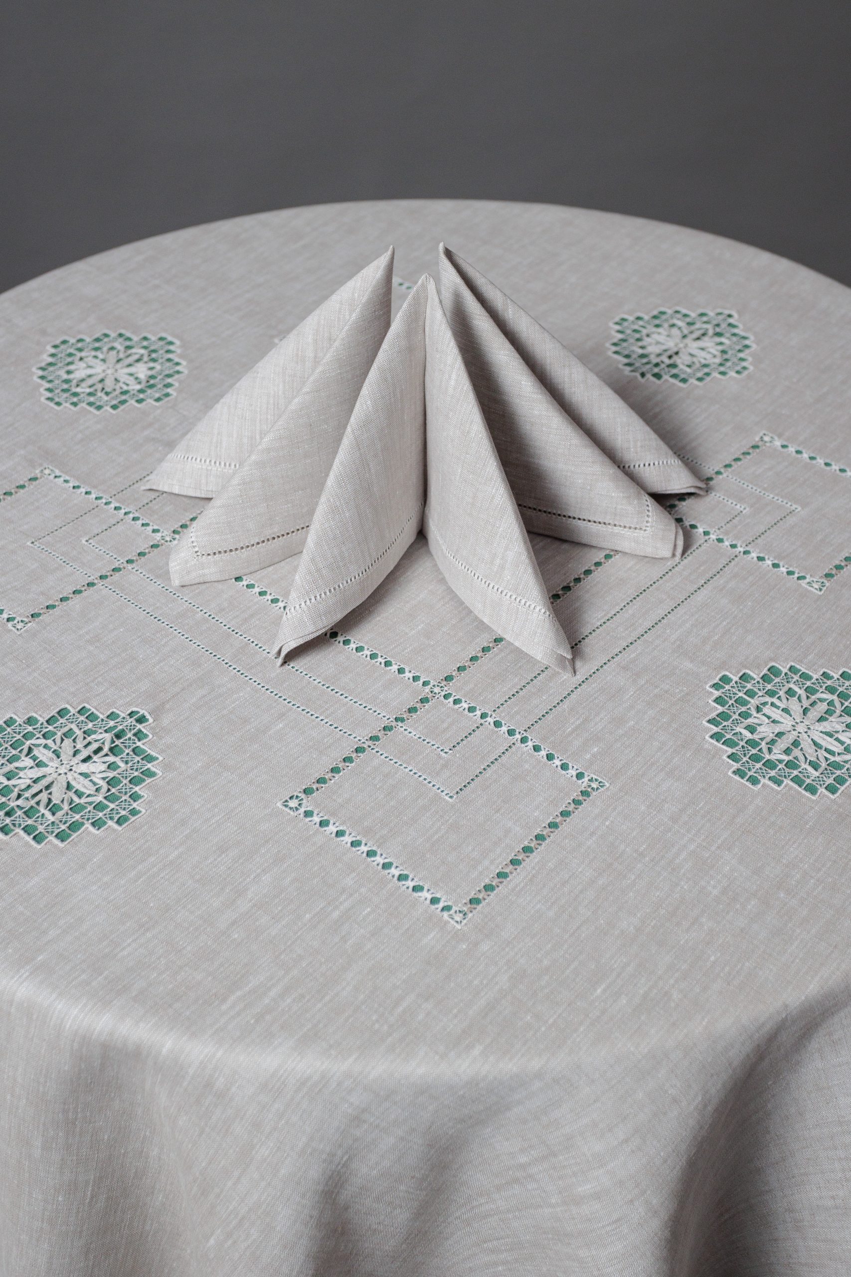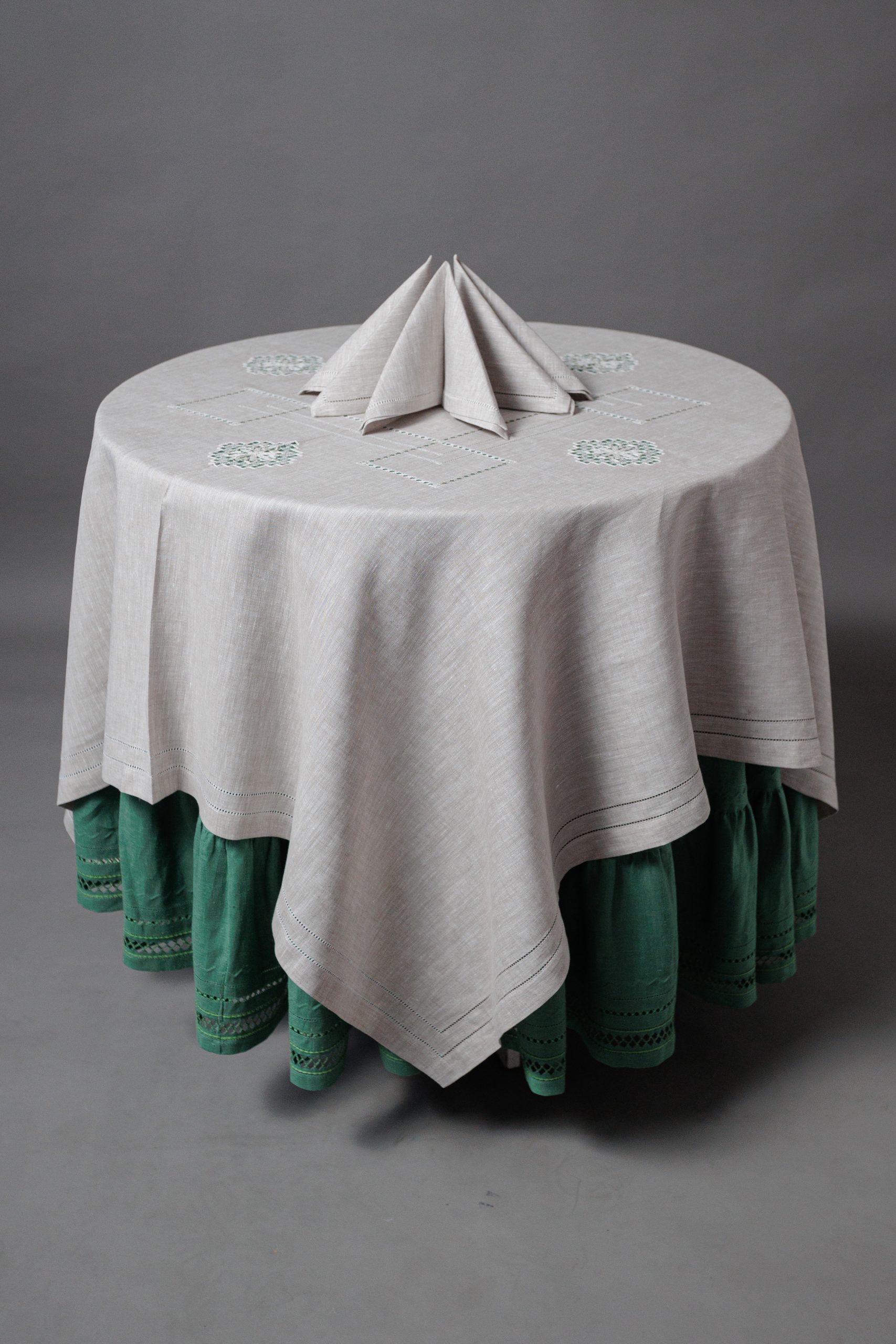 Скатерть с вышивкой «нижегородский гипюр». По периметру скатерти сделаны 2 узкие мережки. В центре вышивка в виде цветка по центру скатерти.