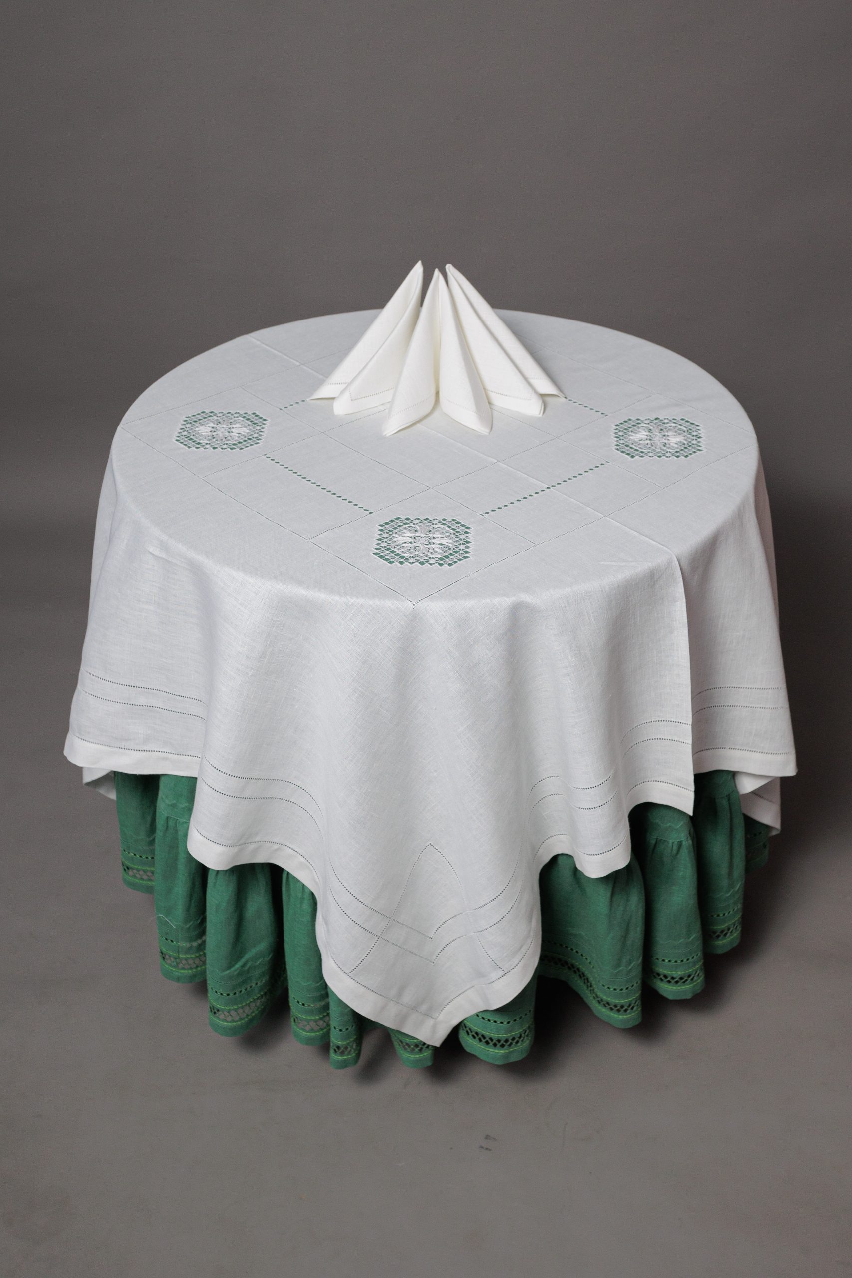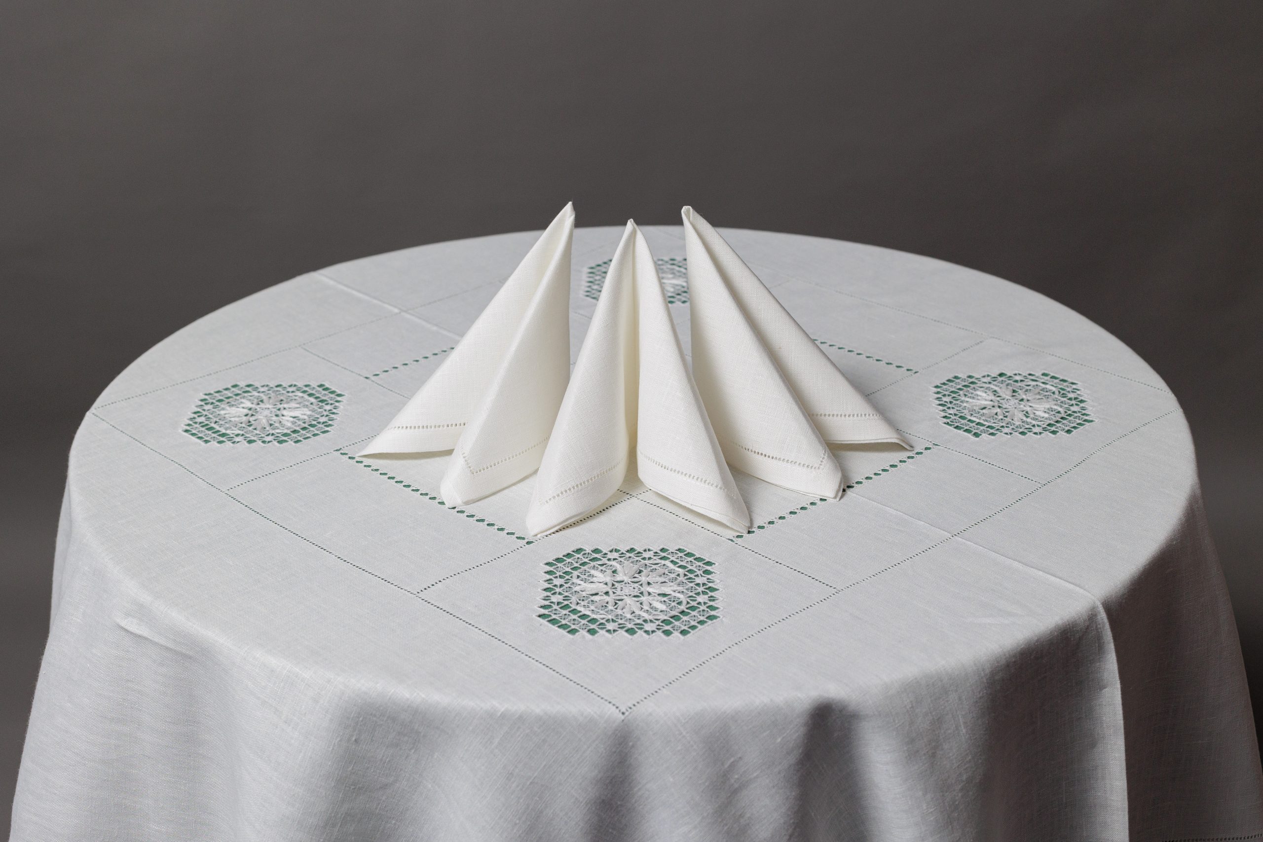 Скатерть с вышивкой «нижегородский гипюр» по центру и по низу узкие мережки, подгибка 2,5 см. Салфетки 32*32 см, подгибка 1,5 см, узкая мережка по краю.